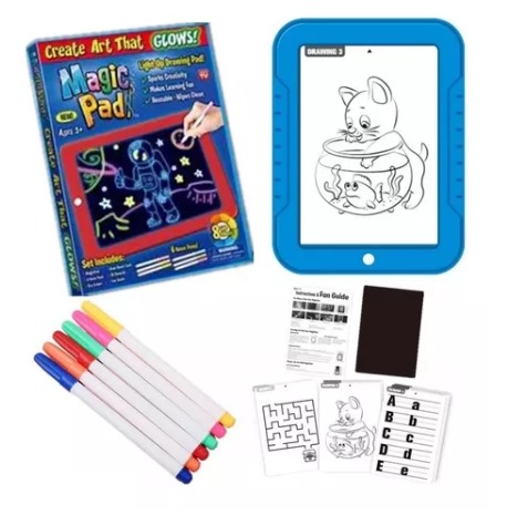 La increíble tableta mágica con luces led cuenta con una pantalla transparente en donde se puede escribir o dibujar lo que quieras con los 6 marcadores neones de diferentes colores incluidos, la pantalla cuenta con un botón que enciende una luz en la pantalla, a medida que lo presionas va cambiando de color y crea un increíble efecto brillante con la tinta de los marcadores que hacen que brille en la oscuridad.Incluye plantillas con diferentes dibujos, juegos y retos para recrear divertidas actividades y aprender con las diferentes temáticas.La luz de la tableta funciona con 2 pilas AA (No incluidas).La Tableta Mágica a color es una excelente herramienta para desarrollar la creatividad de los niños, permite hacer divertido el aprendizaje, desarrollando habilidades motrices, espaciales, creatividad, matemáticas y mucho más.Material: PlásticoMedidas: 19,3cm x 25,5cm x 1cmIncluye:- 1 Tableta mágica con luces- 6 Marcadores- Plantilas con dibujos y actividades- Plantilla negra de fondo- Paño para borrar